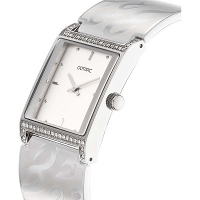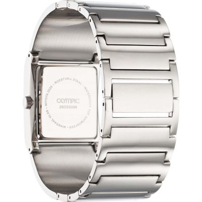 This Olympic watch has a case made of stainless steel with a diameter of 28 mm and is fitted with a stainless steel band. Inside the case lies a Miyota movement and the watch features a Mineral crystal.