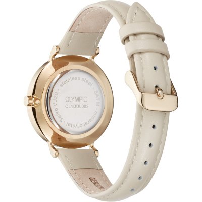 This Olympic watch has a case made of stainless steel with a diameter of 32 mm and is fitted with a leather band. Inside the case lies a Seiko Instruments Inc. movement and the watch features a Mineral crystal.