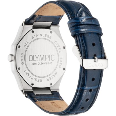 This Olympic watch has a case made of stainless steel with a diameter of 40 mm and is fitted with a leather band. Inside the case lies a Miyota movement and the watch features a Mineral crystal.