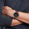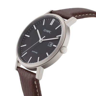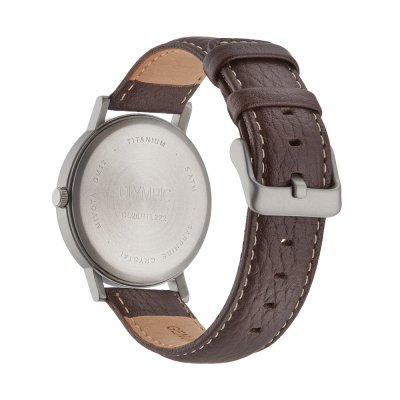 This Olympic watch has a case made of titanium with a diameter of 40 mm and is fitted with a leather band. Inside the case lies a Miyota movement and the watch features a Sapphire crystal.