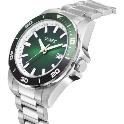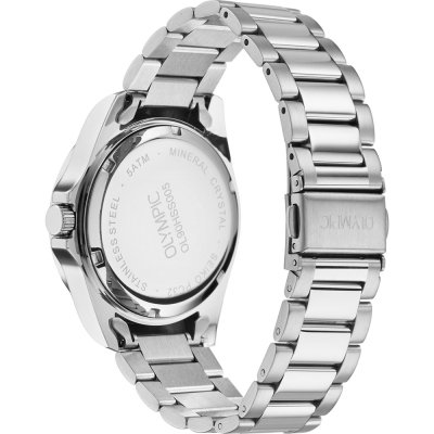 This Olympic watch has a case made of stainless steel with a diameter of 40 mm and is fitted with a stainless steel band. Inside the case lies a Seiko Instruments Inc. movement and the watch features a Mineral crystal.