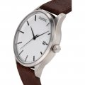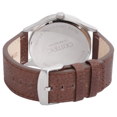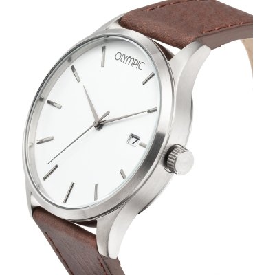 This Olympic watch has a case made of stainless steel with a diameter of 45 mm and is fitted with a leather band. Inside the case lies a Miyota movement and the watch features a Mineral crystal.