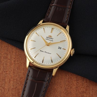 This Orient watch has a case made of stainless steel with a diameter of 40 mm and is fitted with a leather band. Inside the case lies a Orient movement and the watch features a Mineral crystal.