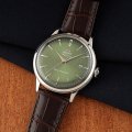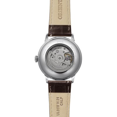 This Orient watch has a case made of stainless steel with a diameter of 40 mm and is fitted with a leather band. Inside the case lies a Orient movement and the watch features a Mineral crystal.