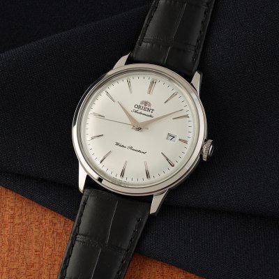 This Orient watch has a case made of stainless steel with a diameter of 40 mm and is fitted with a leather band. Inside the case lies a Orient movement and the watch features a Mineral crystal.