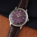 This Orient watch has a case made of stainless steel with a diameter of 40 mm and is fitted with a leather band. Inside the case lies a Orient movement and the watch features a Mineral crystal.