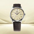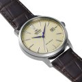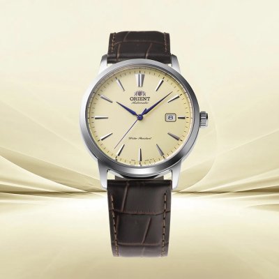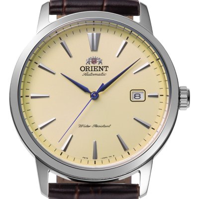This Orient watch has a case made of stainless steel with a diameter of 42 mm and is fitted with a leather band. Inside the case lies a Orient movement and the watch features a Mineral crystal.