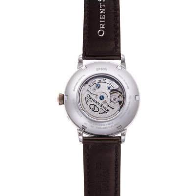 This Orient watch has a case made of stainless steel with a diameter of 41 mm and is fitted with a leather band. Inside the case lies a Orient movement and the watch features a Single anti-reflective sapphire crystal.