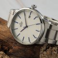 This Orient watch has a case made of stainless steel with a diameter of 40 mm and is fitted with a stainless steel band. Inside the case lies a Orient movement and the watch features a Mineral crystal.