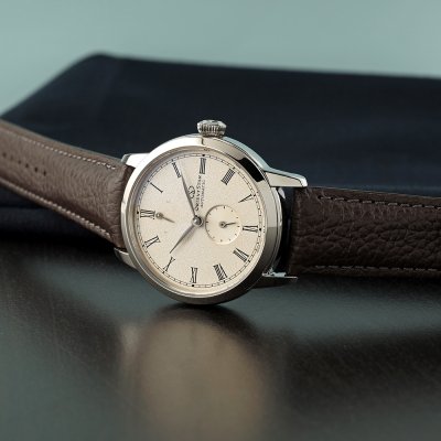 The beautiful M45 F7 watches combine classic elements with a modern finish. It is a compact and elegant dress watch featuring a dial with a sandblasted, textured and matte dial. The watch is powered by a F7H44 automatic movement, finished with Geneva stripes and chamfered edges. The watch is finished with a dual curved, anti-reflective sapphire crystal on the front and a sapphire crystal case back, showing off the movement.
