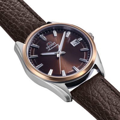 This Orient watch has a case made of stainless steel with a diameter of 38 mm and is fitted with a leather band. Inside the case lies a Orient movement and the watch features a Sapphire crystal.