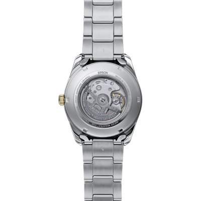 This Orient watch has a case made of stainless steel with a diameter of 41 mm and is fitted with a stainless steel band. Inside the case lies a Epson movement and the watch features a Sapphire crystal.