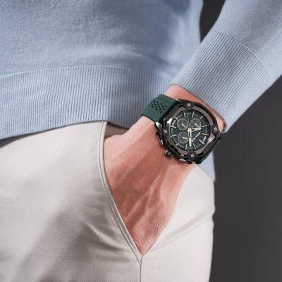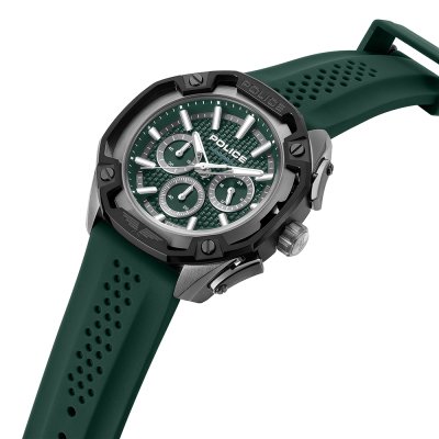 This Police watch has a case made of stainless steel with a diameter of 46 mm and is fitted with a rubber band. Inside the case lies a Seiko Instruments Inc. movement and the watch features a Mineral crystal.
