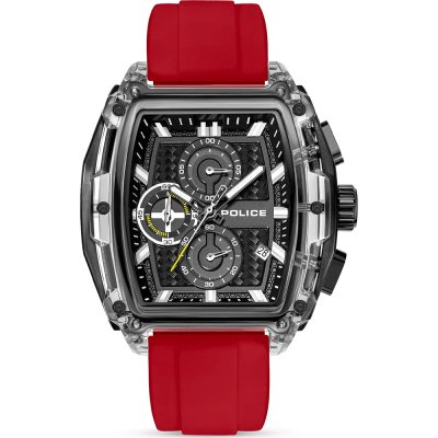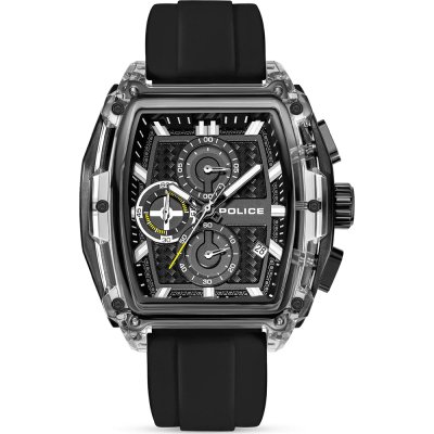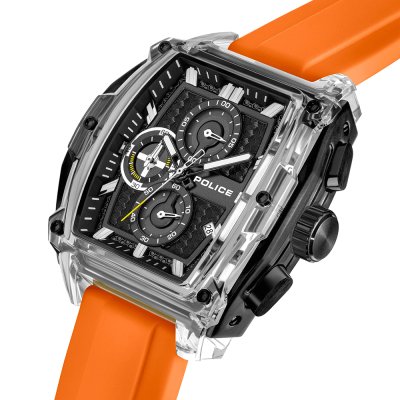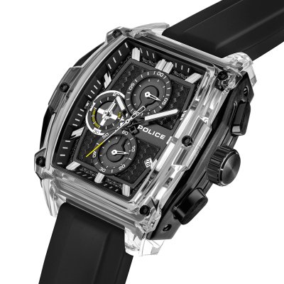 This Police watch has a case made of Resin with a diameter of 46 mm and is fitted with a rubber band. Inside the case lies a Seiko Instruments Inc. movement and the watch features a Mineral crystal.