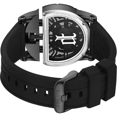 This Police watch has a case made of stainless steel with a diameter of 46 mm and is fitted with a rubber band. Inside the case lies a Miyota movement and the watch features a Mineral crystal.