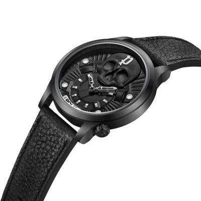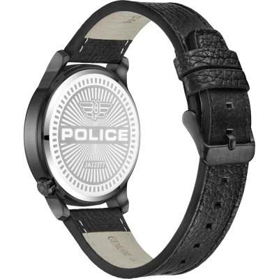 This Police watch has a case made of stainless steel with a diameter of 44 mm and is fitted with a leather band. Inside the case lies a Seiko movement and the watch features a Mineral crystal.