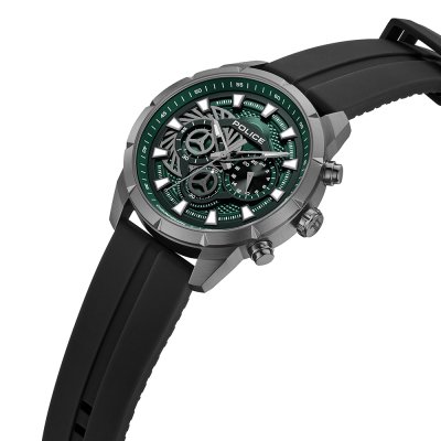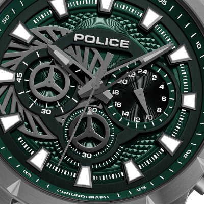 This Police watch has a case made of stainless steel with a diameter of 45 mm and is fitted with a rubber band. Inside the case lies a Seiko Instruments Inc. movement and the watch features a Mineral crystal.
