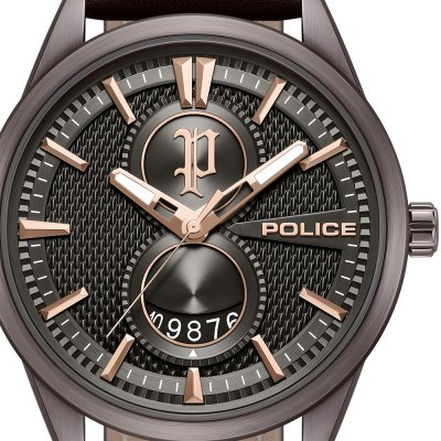 This Police watch has a case made of stainless steel with a diameter of 43 mm and is fitted with a leather band. Inside the case lies a Seiko Instruments Inc. movement and the watch features a Mineral crystal.
