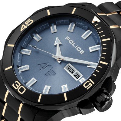 This Police watch has a case made of stainless steel with a diameter of 43 mm and is fitted with a metal band. Inside the case lies a Miyota movement and the watch features a Mineral crystal.