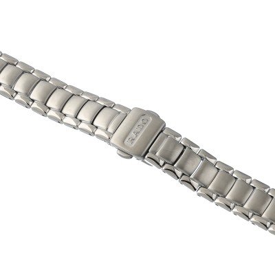 This Rado watch strap is made of stainless steel and is attached to the watch by means of pin and tube. The band has a width of 12 mm and is closed by means of a deployment clasp with push buttons. The strap has no straight mount which means that this strap is only suitable for the watches listed below.