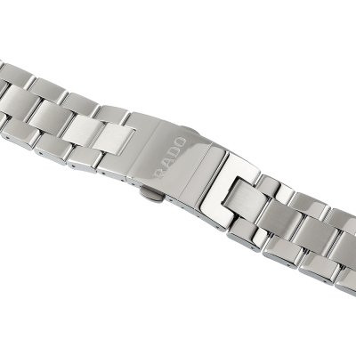 This Rado watch strap is made of stainless steel and is attached to the watch by means of pushpins. The band has a width of 21 mm and is closed by means of a deployment clasp with push buttons. The strap has no straight mount which means that this strap is only suitable for the watches listed below.