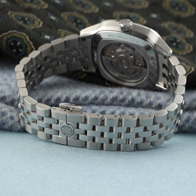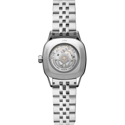 The 3D herringbone W-pattern immediately draws the eye to the dial of this very stylish Raymond Weil ladies watch. Its rounded square case with rounded corners and glossy finish contrasts with the matte gradient dial, again focusing your attention to what a watch should be about. The watch further features an automatic Swiss-made movement, with a 38 hours power reserve, ideally suited for daily wear.