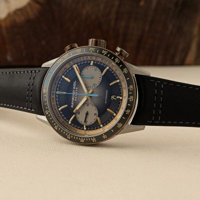 This Raymond Weil watch has a case made of titanium with a diameter of 43.5 mm and is fitted with a leather band. Inside the case lies a Raymond Weil movement and the watch features a Double anti-reflective sapphire crystal.
