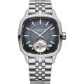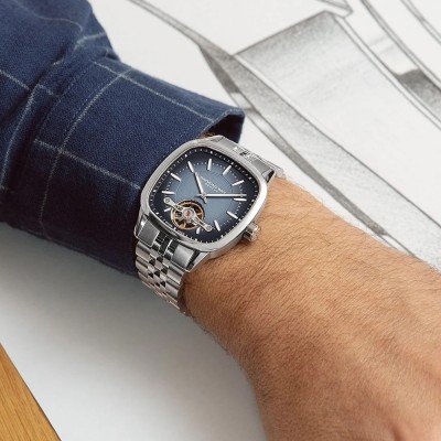 As expected from Raymond Weil, the attention to detail with this Freelancer watch is admirable. The elegant cushion shape of the case is continued in the hour indices and hands. The gradient dial features different levels and textures as well as a window into the movement. The in house Calibre RW1212 has a power reserve of 41 hours and a W-shaped oscillating weight, with the bridge forming a visual connection to the watch face. The various facets, lines and curves of the watch play with light, accentuating its beauty.