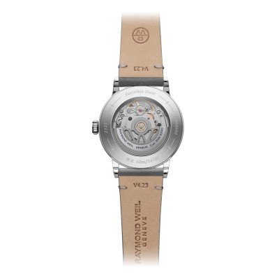 This Raymond Weil watch has a case made of stainless steel with a diameter of 35 mm and is fitted with a leather band. Inside the case lies a Sellita movement and the watch features a Sapphire crystal.