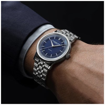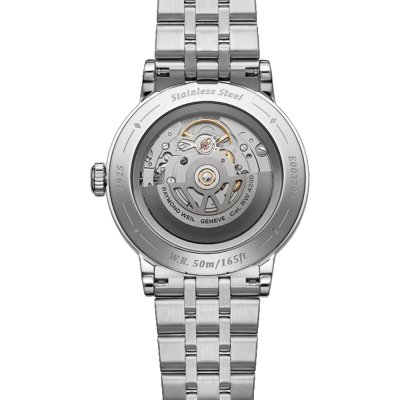 This Raymond Weil watch has a case made of stainless steel with a diameter of 39 mm and is fitted with a stainless steel band. Inside the case lies a Sellita movement and the watch features a Sapphire crystal.