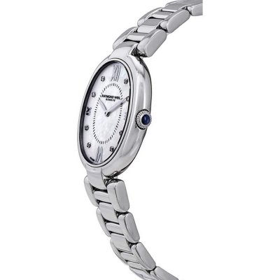 This gorgeous Raymond Weil Shine ladies watch is decorated with eight genuine diamonds. It comes with an easily exchanged stainless steel and a black leather strap to match your watch to your outfit or your mood.This refined ladies watch has an oval shape which enhances its elegance with a classic undertone.