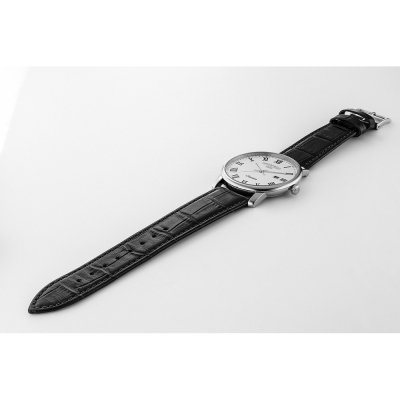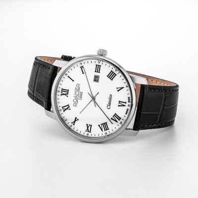 This Roamer watch has a case made of stainless steel with a diameter of 40 mm and is fitted with a leather band. Inside the case lies a Ronda movement and the watch features a Sapphire crystal.