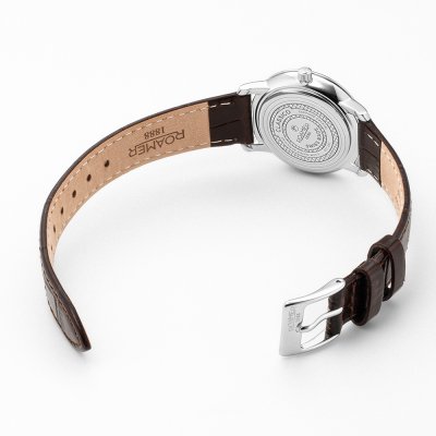 This Roamer watch has a case made of stainless steel with a diameter of 30 mm and is fitted with a leather band. Inside the case lies a Ronda movement and the watch features a Sapphire crystal.