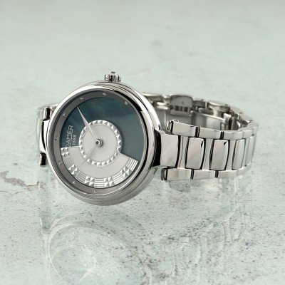 This Roamer watch has a case made of stainless steel with a diameter of 36 mm and is fitted with a stainless steel band. Inside the case lies a Ronda movement and the watch features a Sapphire crystal.
