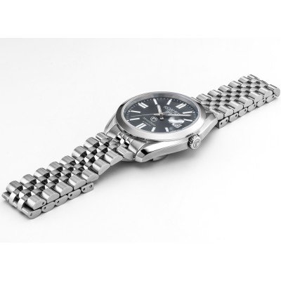 This Roamer watch has a case made of stainless steel with a diameter of 41.5 mm and is fitted with a stainless steel band. Inside the case lies a Soprod movement and the watch features a Sapphire crystal.