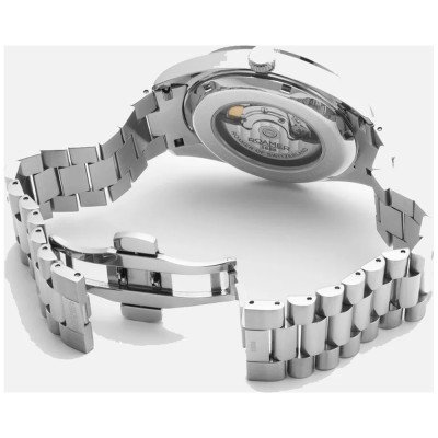 This Roamer watch has a case made of stainless steel with a diameter of 42 mm and is fitted with a stainless steel band. Inside the case lies a Sellita movement and the watch features a Sapphire crystal.
