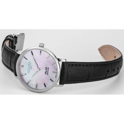 This Roamer watch has a case made of stainless steel with a diameter of 32 mm and is fitted with a leather band. Inside the case lies a Ronda movement and the watch features a Sapphire crystal.