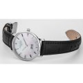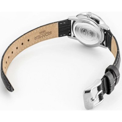 This Roamer watch has a case made of stainless steel with a diameter of 32 mm and is fitted with a leather band. Inside the case lies a Ronda movement and the watch features a Sapphire crystal.