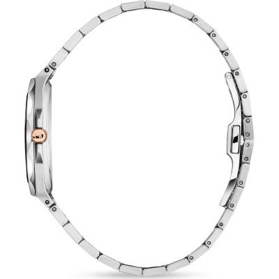 This Saint Honoré watch has a case made of stainless steel with a diameter of 33 mm and is fitted with a stainless steel band. Inside the case lies a Ronda movement and the watch features a Mineral crystal.