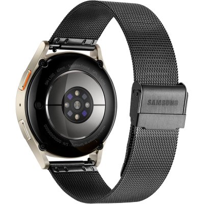 This Samsung watch has a case made of Aluminum with a diameter of 40 mm and is fitted with a stainless steel band. Inside the case lies a Samsung movement and the watch features a Sapphire crystal.