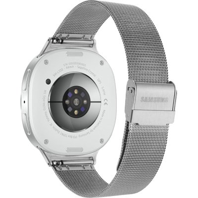 This Samsung watch has a case made of Aluminum with a diameter of 44 mm and is fitted with a stainless steel band. Inside the case lies a Samsung movement and the watch features a Sapphire crystal.