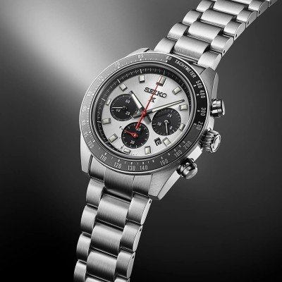 This Seiko watch has a case made of stainless steel with a diameter of 41.4 mm and is fitted with a stainless steel band. Inside the case lies a Seiko movement and the watch features a Sapphire crystal.
