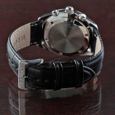 This Seiko watch has a case made of stainless steel with a diameter of 41.5 mm and is fitted with a leather band. Inside the case lies a Seiko movement and the watch features a Hardlex crystal crystal.