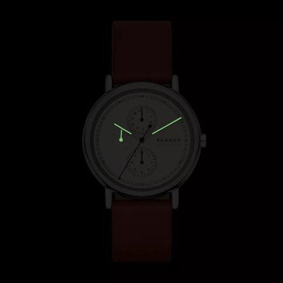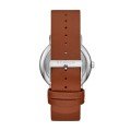 This Skagen watch has a case made of stainless steel with a diameter of 40 mm and is fitted with a leather band. Inside the case lies a Miyota movement and the watch features a Mineral crystal.
