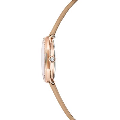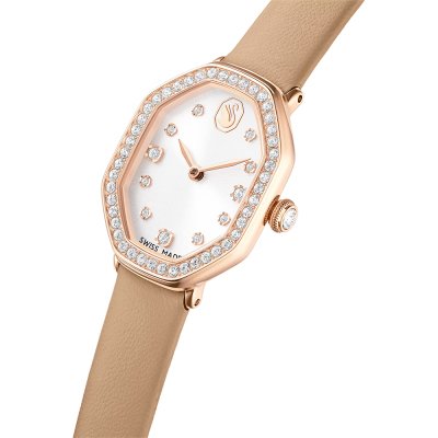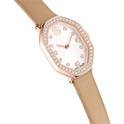 This Swarovski watch has a case made of stainless steel with a diameter of 18 mm and is fitted with a leather band. Inside the case lies a Ronda movement and the watch features a Mineral crystal.