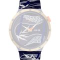 This Swatch watch strap is made of silicone and is attached to the watch by means of steel pins. The band has a width of 19.7 mm and is closed by means of a buckle. The strap has no straight mount which means that this strap is only suitable for the watches listed below.