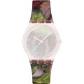 This Swatch watch strap is made of silicone and is attached to the watch by means of steel pins. The band has a width of 17 mm and is closed by means of a buckle. The strap has no straight mount which means that this strap is only suitable for the watches listed below.
