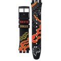 This Swatch watch strap is made of silicone and is attached to the watch by means of steel pins. The band has a width of 19.7 mm and is closed by means of a buckle. The strap has no straight mount which means that this strap is only suitable for the watches listed below.