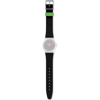 This Swatch watch strap is made of silicone and is attached to the watch by means of steel pins. The band has a width of 17 mm and is closed by means of a buckle. The strap has no straight mount which means that this strap is only suitable for the watches listed below.