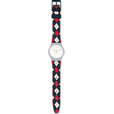 This Swatch watch strap is made of silicone and is attached to the watch by means of steel pins. The band has a width of 17 mm and is closed by means of a buckle. The strap has no straight mount which means that this strap is only suitable for the watches listed below.